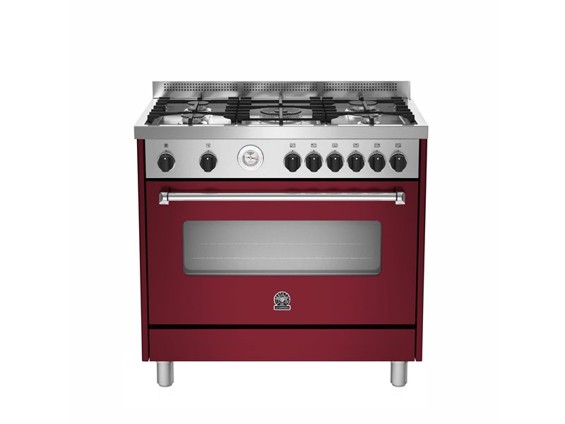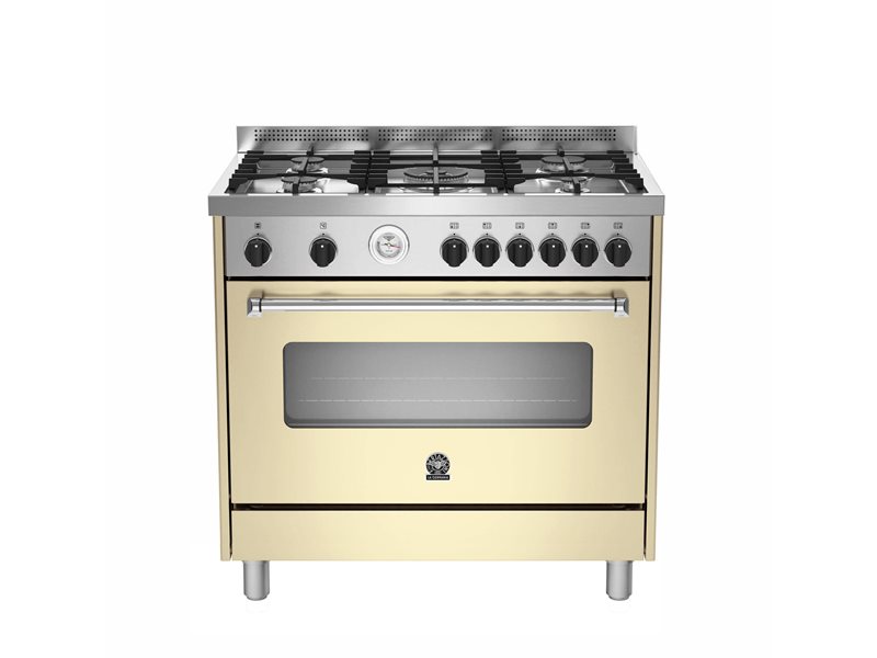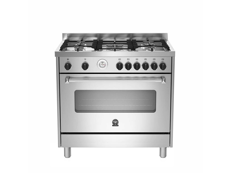 This freestanding stove has a stainless-steel single-piece squared worktop with 5 burners. The electric oven is dual fan assisted and has 9 functions. A dial thermometer on the fascia monitors the oven temperature. The oven door is triple-glass with a wide extractable inner glass. The door has soft motion hinges.