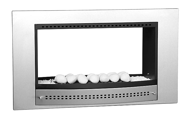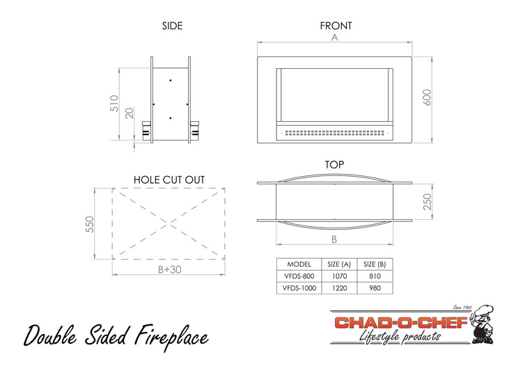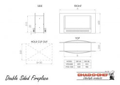 The Double Sided 800 Fireplace incorporates a Flueless burner design for optimal heat output, and must be built into a 850×520 aperture in a double brick wall.